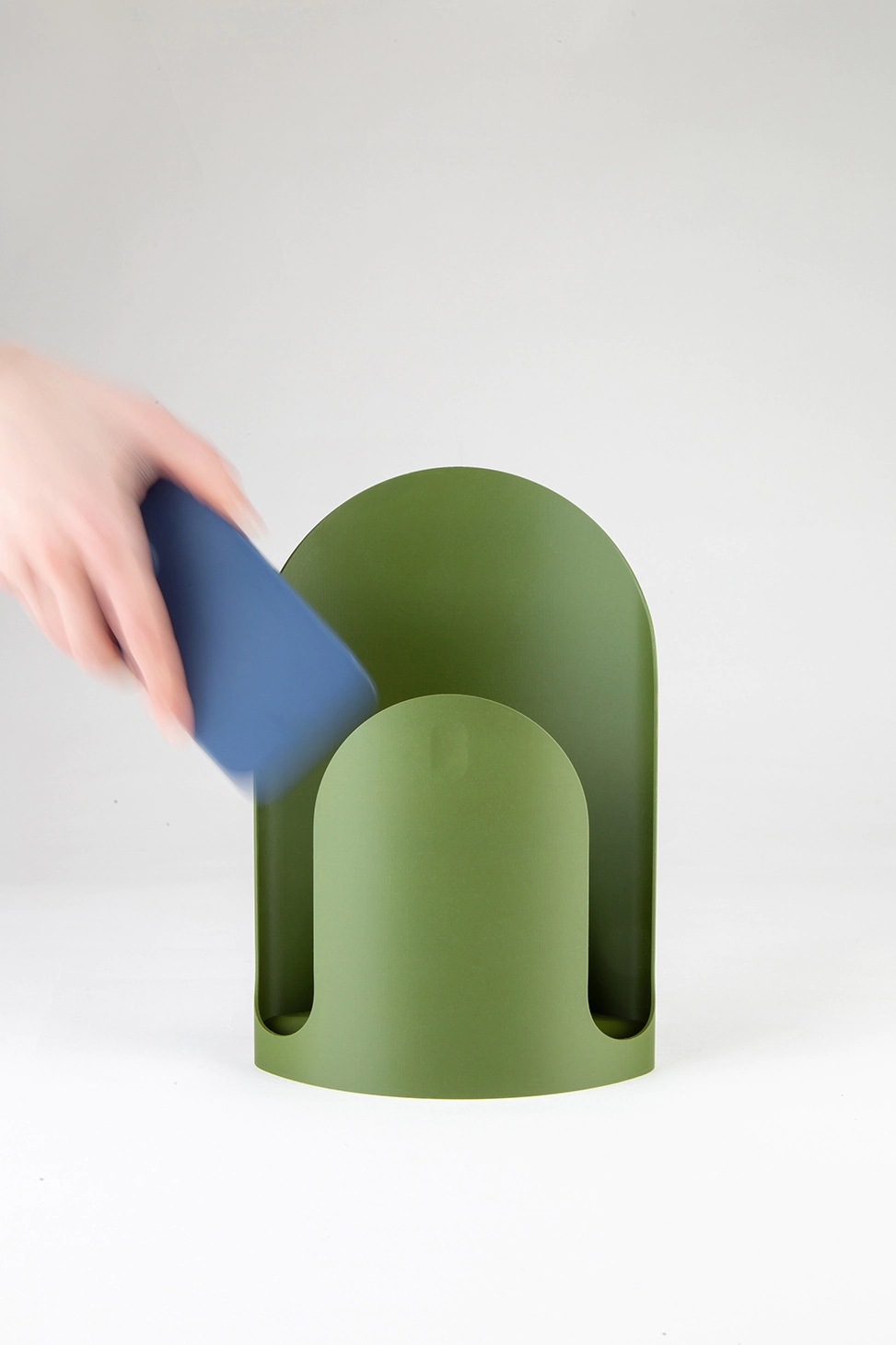 The final design ensures easy phone placement. The front arc hides the phone while allowing access from the front and sides. The back arc serves as a soft light canvas, diffusing and reflecting the LED flashlight for a gentle glow.